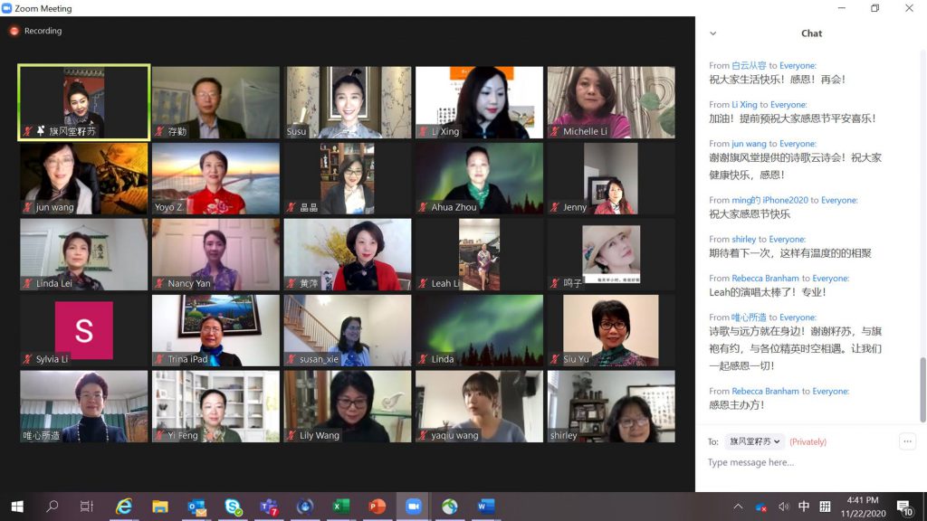 2020年11月22日下午, 由旗风堂主办,星尚文化协办,湾区知名双语主持人黄姝主持的“旗风堂感恩节云诗歌朗诵会”成功举办!